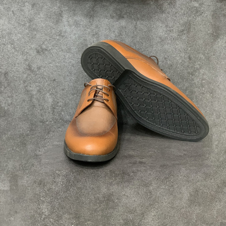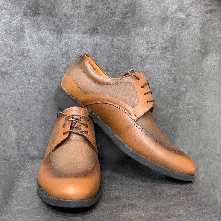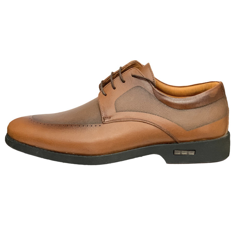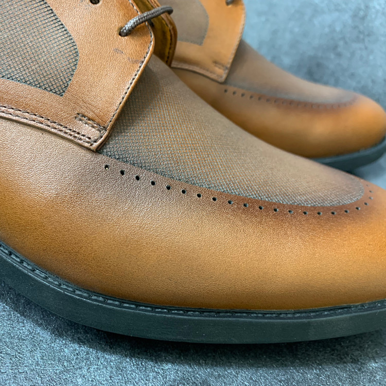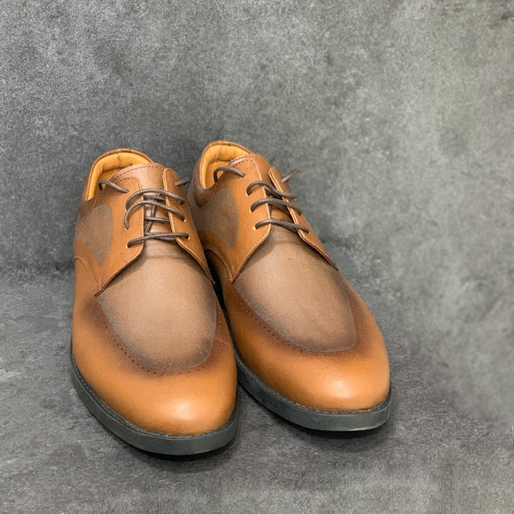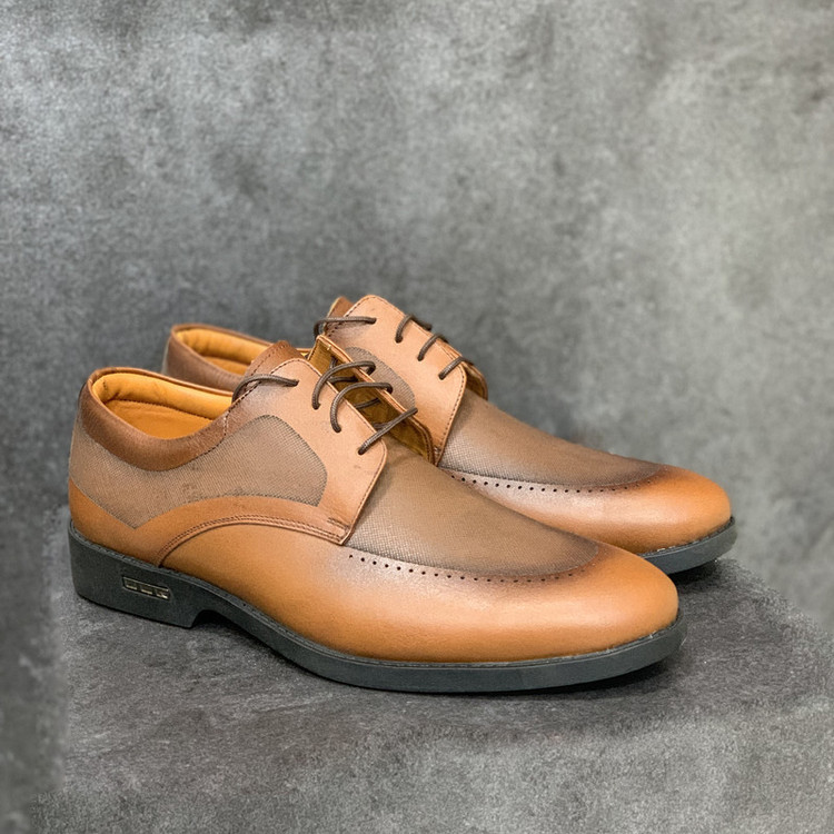 رویه کفش حاضر از چرم طبیعی مرغوب گاوی به رنگ عسلی تهیه شده است که سطح ان با لیزر طرح خورده وجذابیت بیشتری به کفش بخشیده است همچنین استر داخل کفش از جنس چرم بزی به رنگ عسلی میباشد .جنس زیره این کفش ترمو مقاوم در برابر شکستن ،سایش و سر خوردن است..