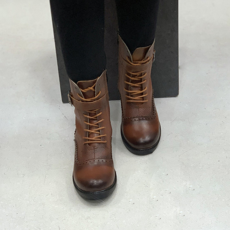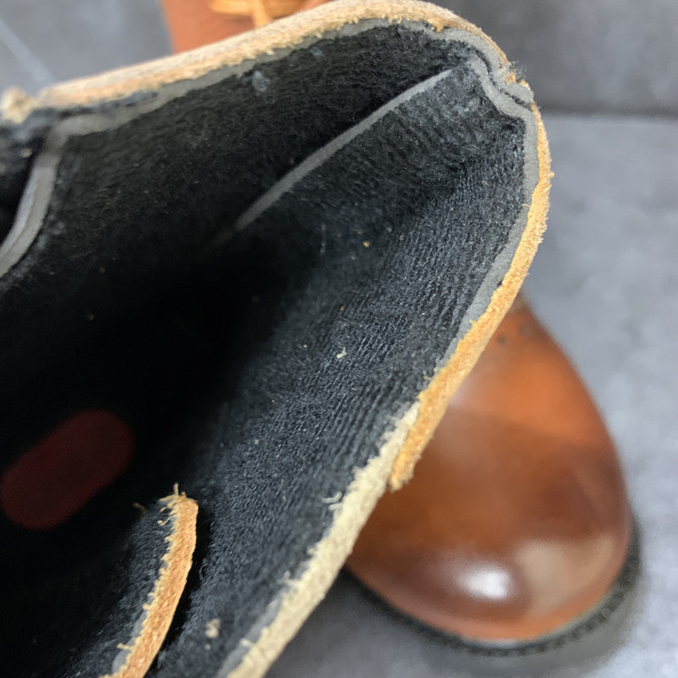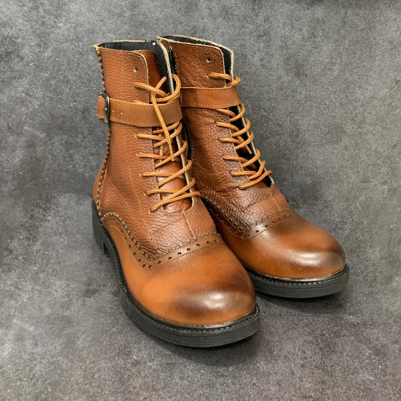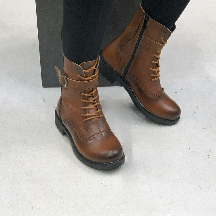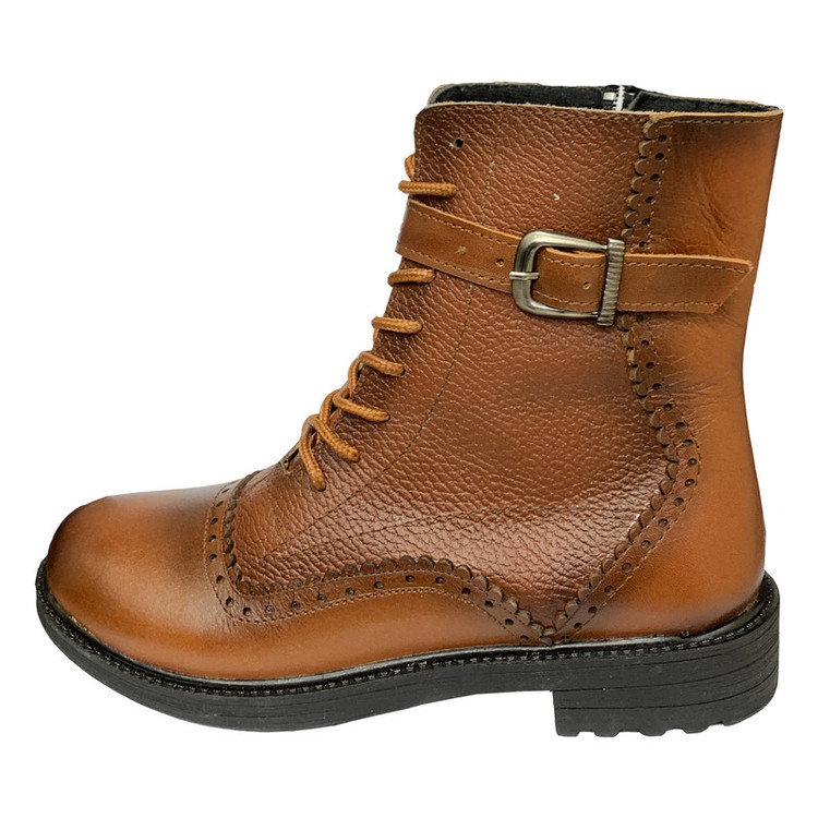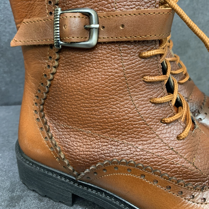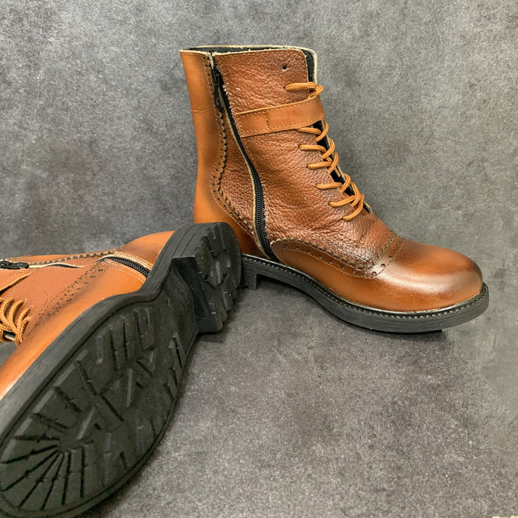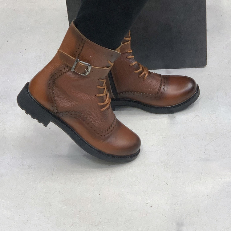 رویه کفش موجود از چرم طبیعی گاوی به رنگ عسلی تهیه شده، داخل کفش با پارچه نرم آستر شده وکفی طبی در داخل کفش تعبیه شده است.ارتفاع ساق این کفش 16 سانتی متر میباشد.