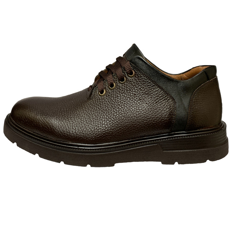 رویه کفش موجود از چرم طبیعی گاوی به رنگ قهوه ای تهیه شده است استر داخلی کفش به جهت زیبایی و راحتی مصرف کننده با چرم مرغوب بزی به رنگ عسلی استر شده است.کفی طبی با رویه چرم موجود در کفش مانع از خستگی وبوی نامطبوع کفش میگردد.زیره کفش از جنس پیو میباشد که سبک و مقاوم در برابر سایش میباشد.