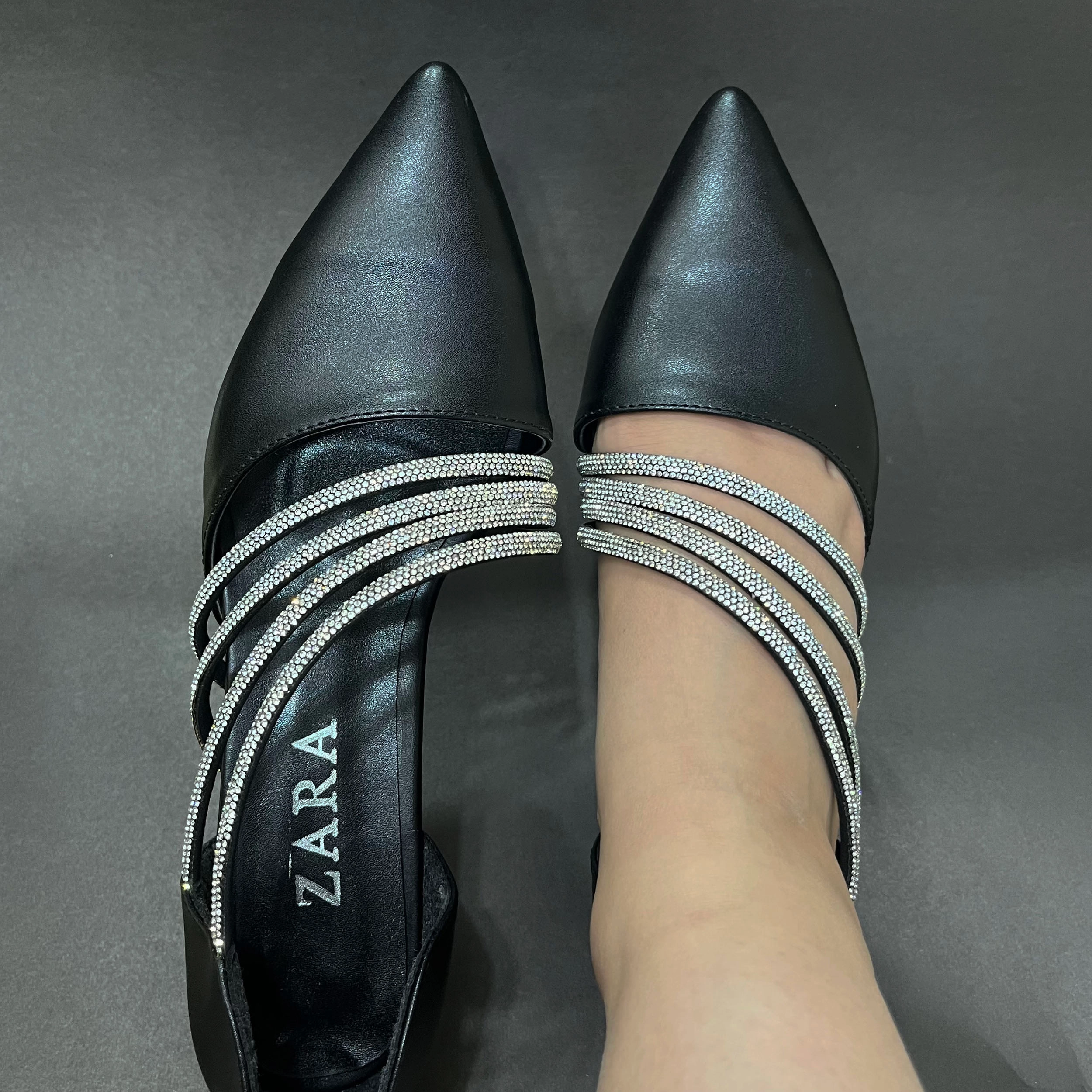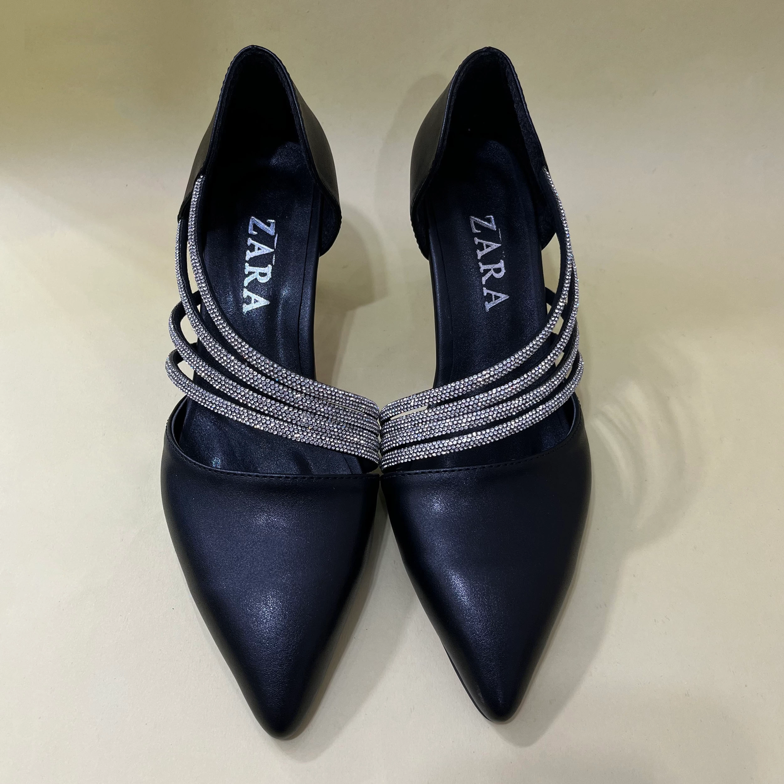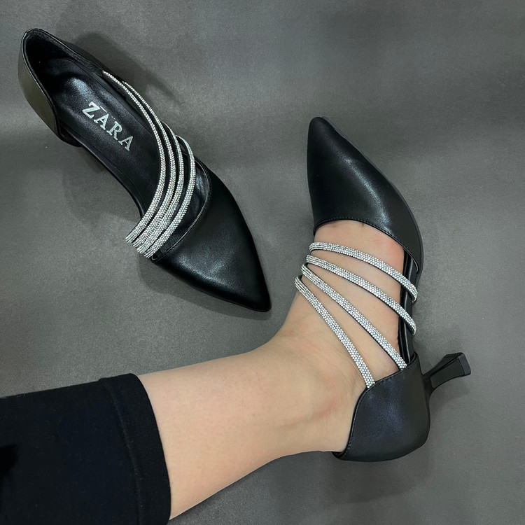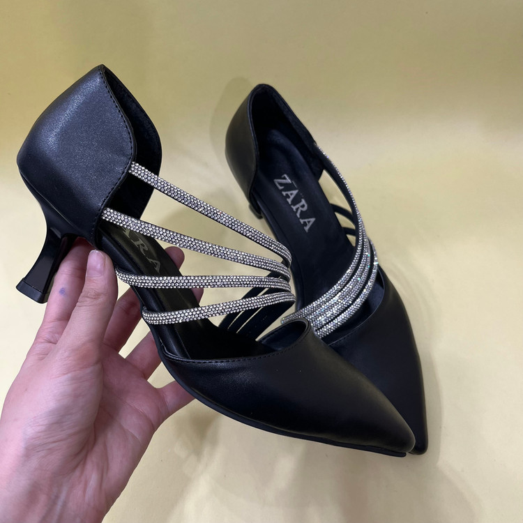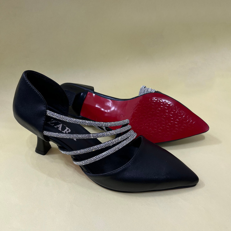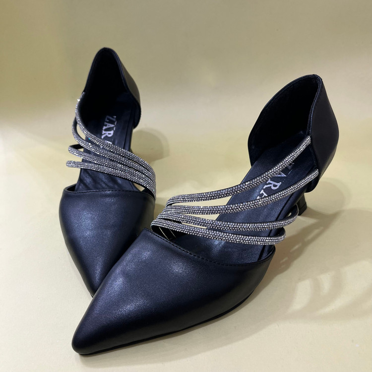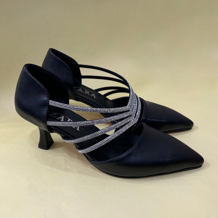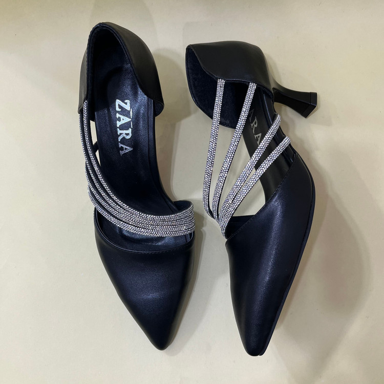 کفش مجلسی زنانه نگینی پاشنه دار مدل آرزو رنگ مشکی ، با رویه چرم صنعتی درجه یک مشکی و زیره مجلسی و سبک داووس تهیه شده است.مدل پاشنه کفش فرانسوی با ارتفاع 6 سانتی متر میباشد.ردیف نگین های بکار رفته در روی کفش پرس شده و دوام بالایی دارند.این کفش بعلت شیب ملایمی که دارد بسیار راحت و مناسب استفاده طولانی میباشد.قالب کار نیم سایز بزرگ است.