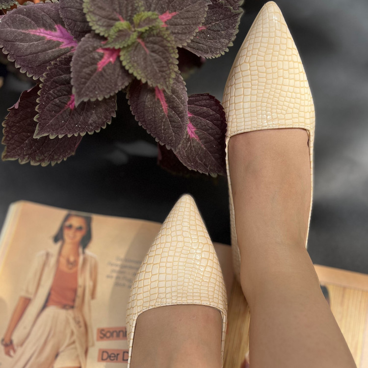 رویه کفش تماما از چرم مصنوعی طرحدار به رنگ کرم تهیه شده است . داخل کفش با چرم صنعتی استر شده و پشت پا به جهت راحتی وایجاد اصطحکاک با یک تیکه چرم مصنوعی استر شده است.کفی کفش کار شده است و برامدگی کف قوس پا را پر میکند و استفاده از کفش را راحت میسازد.