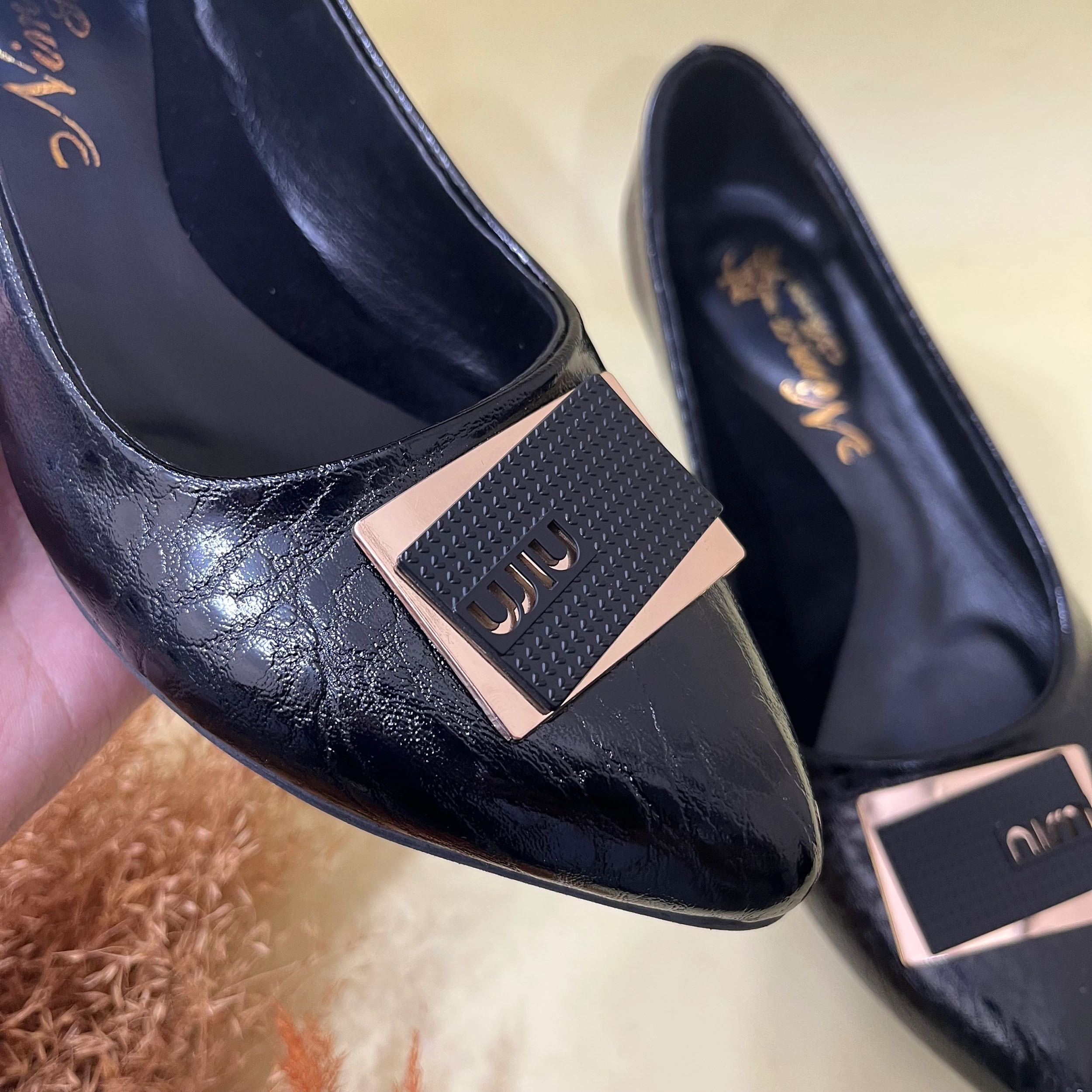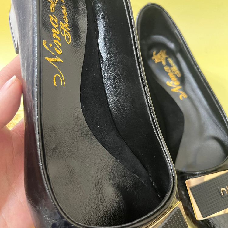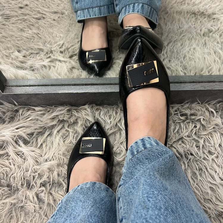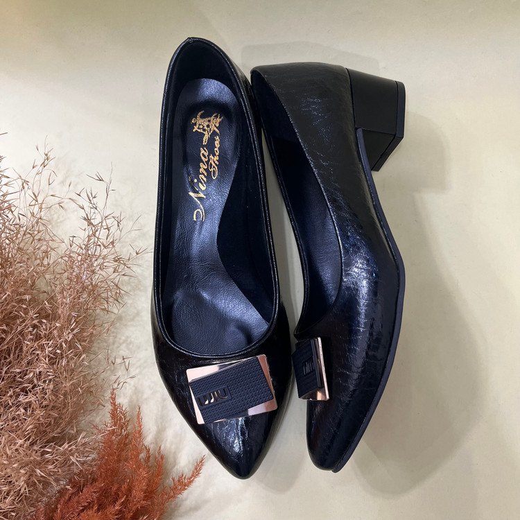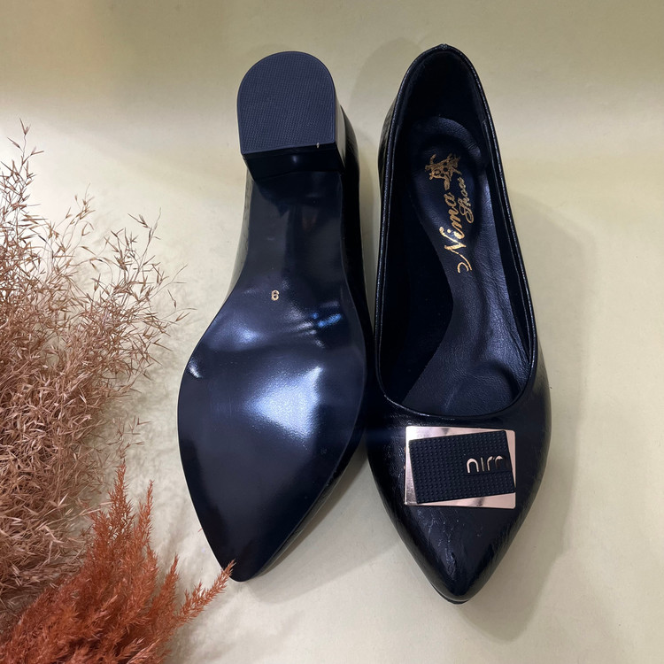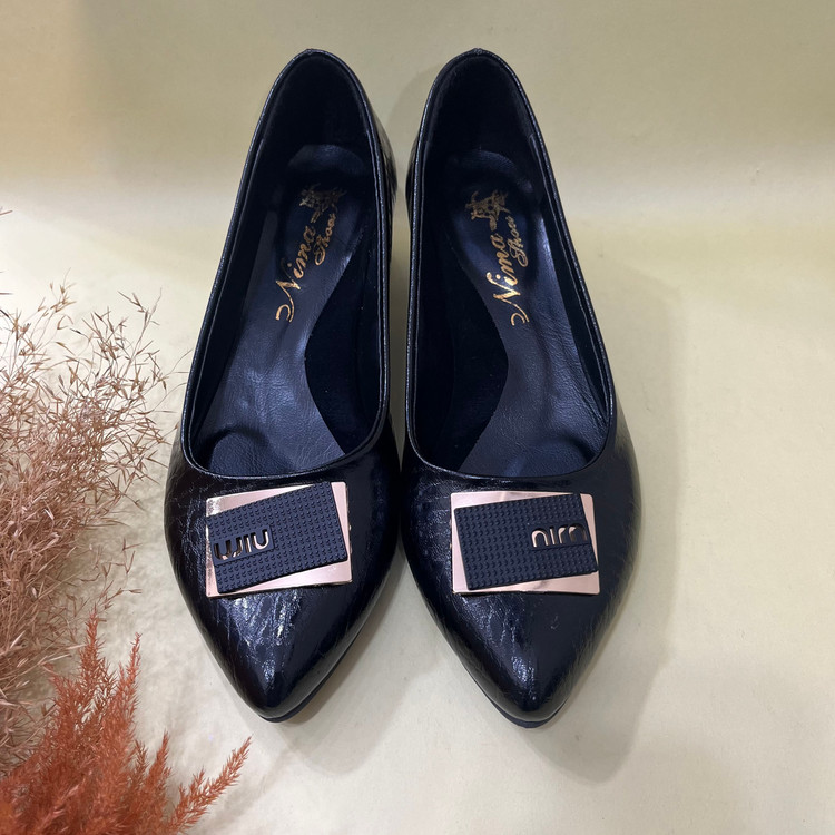 رویه کفش پاشنه دار زنانه مدل میو از از چرم صنعتی ورنی مشکی تهیه شده است کف داخل کفش کارشده است تا قوس پا را هنگام استفاده پوشش دهد. زیره این کار سبک با کفی قرمز رنگ میباشد. ارتفاع پاشنه 4 سانتی متر میباشد و قالب کفش بزرگ پا است.از سایز 39 تا 43
