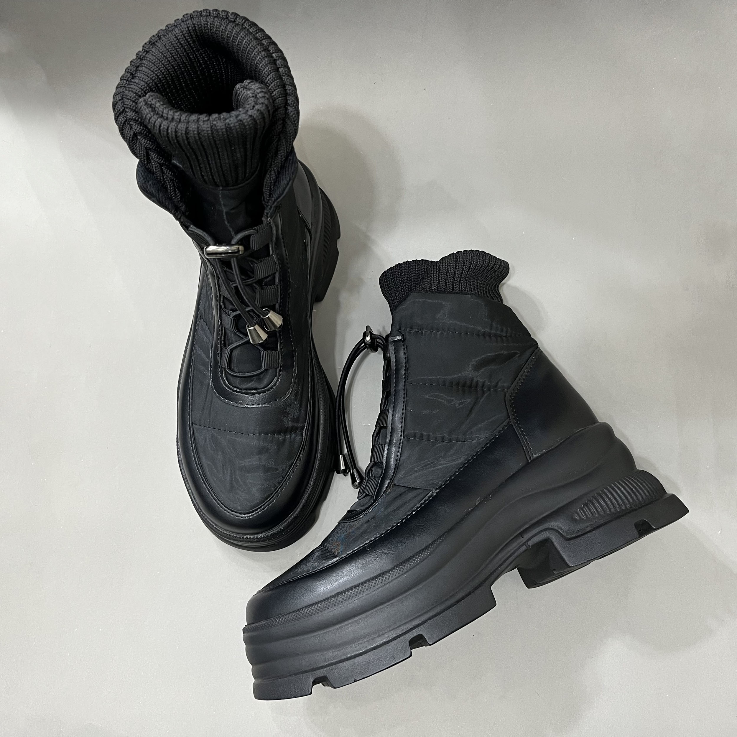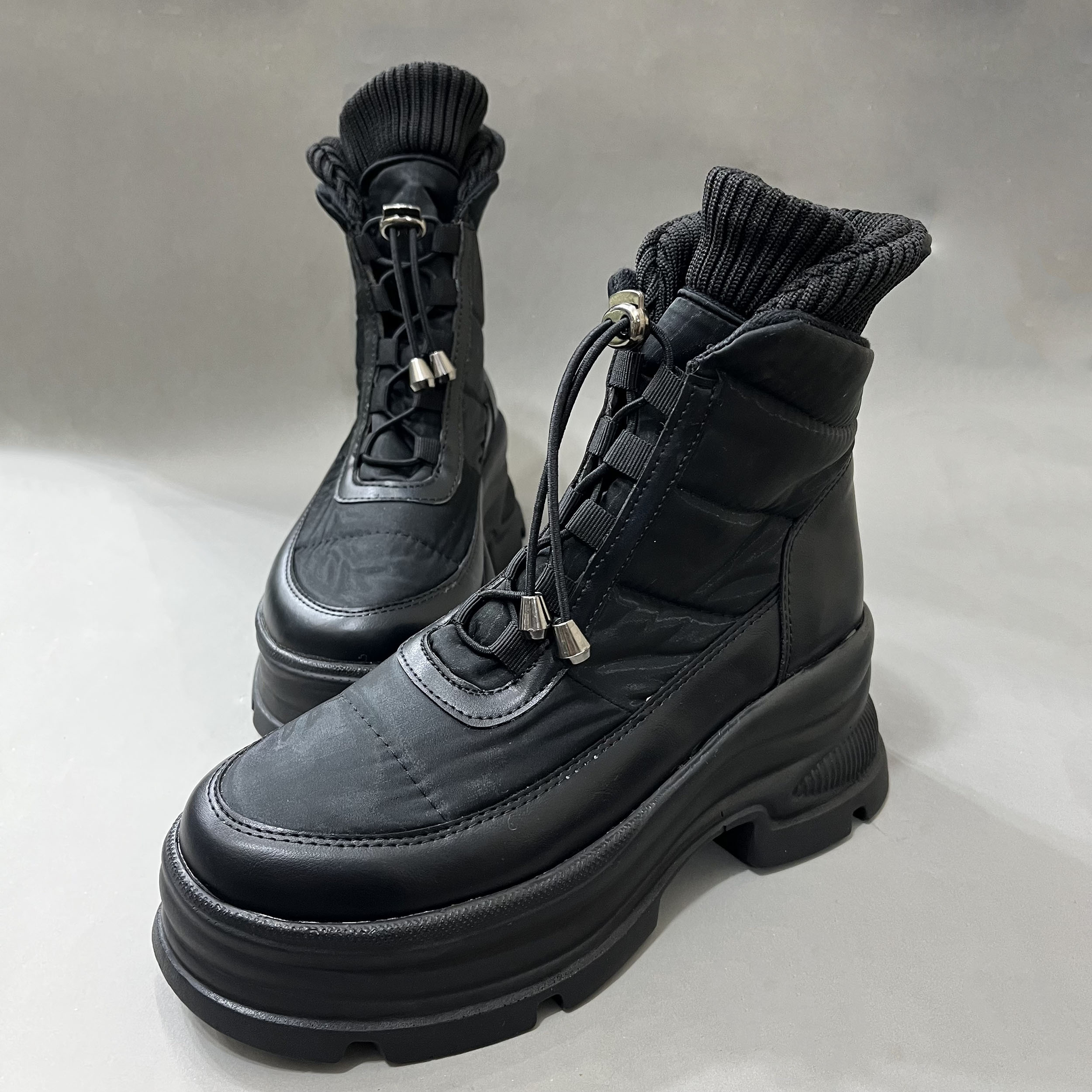 نیم بوت زنانه کاپشنی با رویه ترکیبی از پارچه ضد اب و چرم صنعتی تهیه شده است .زیره این بوت از پی یو سبک و مقاوم در برابر شکستن و سایش تهیه شده است.ارتفاع ساق کفش 15 سانتی متر و باز و بست نیم بوت به وسیله بندهای کشی کفش میباشد. داخل کفش و کف ان به جهت راحتی پا و گرم نگه داشتن آن به وسیله پارچه پرز دار آستر کشی شده است.سایزبندی کفش استاندارد است .