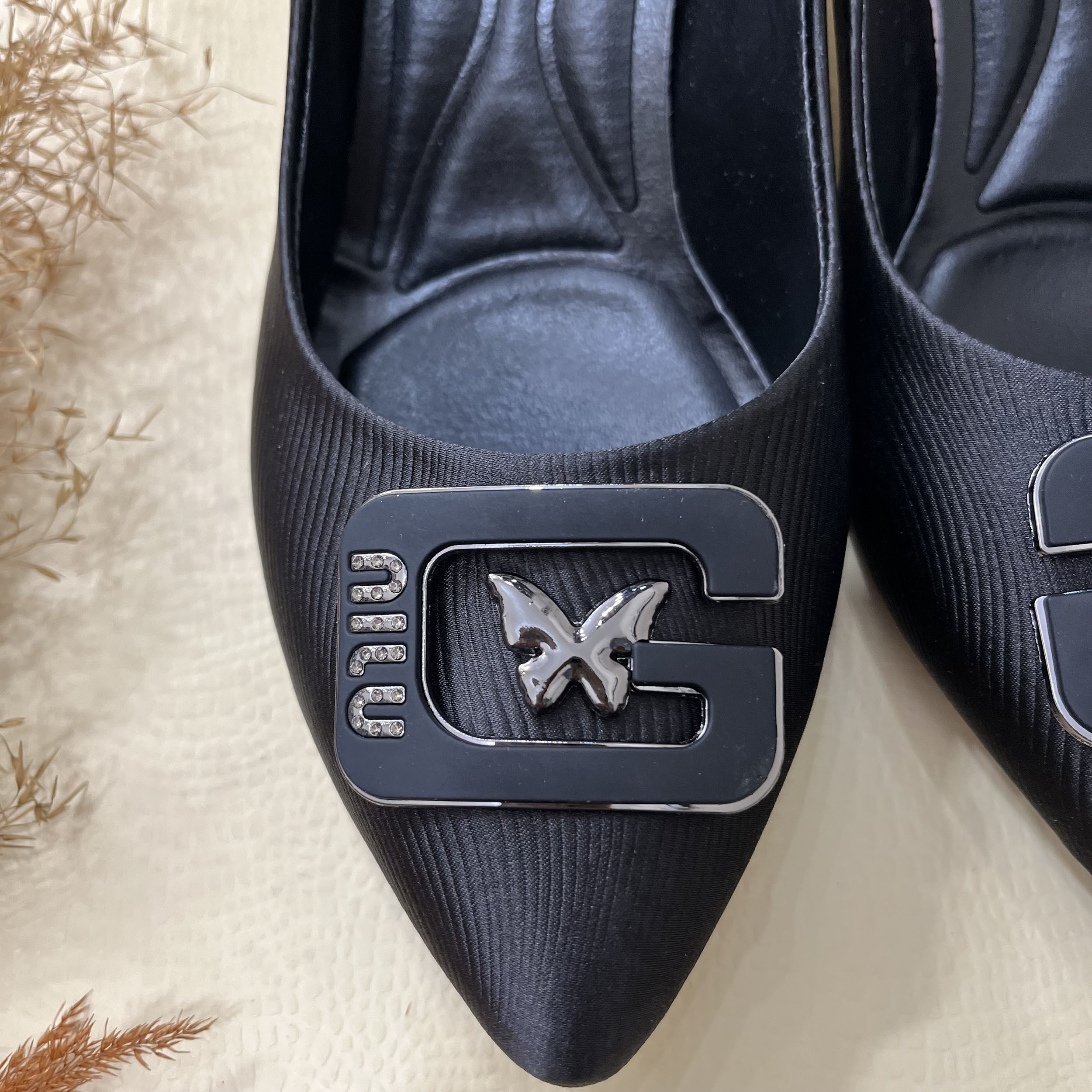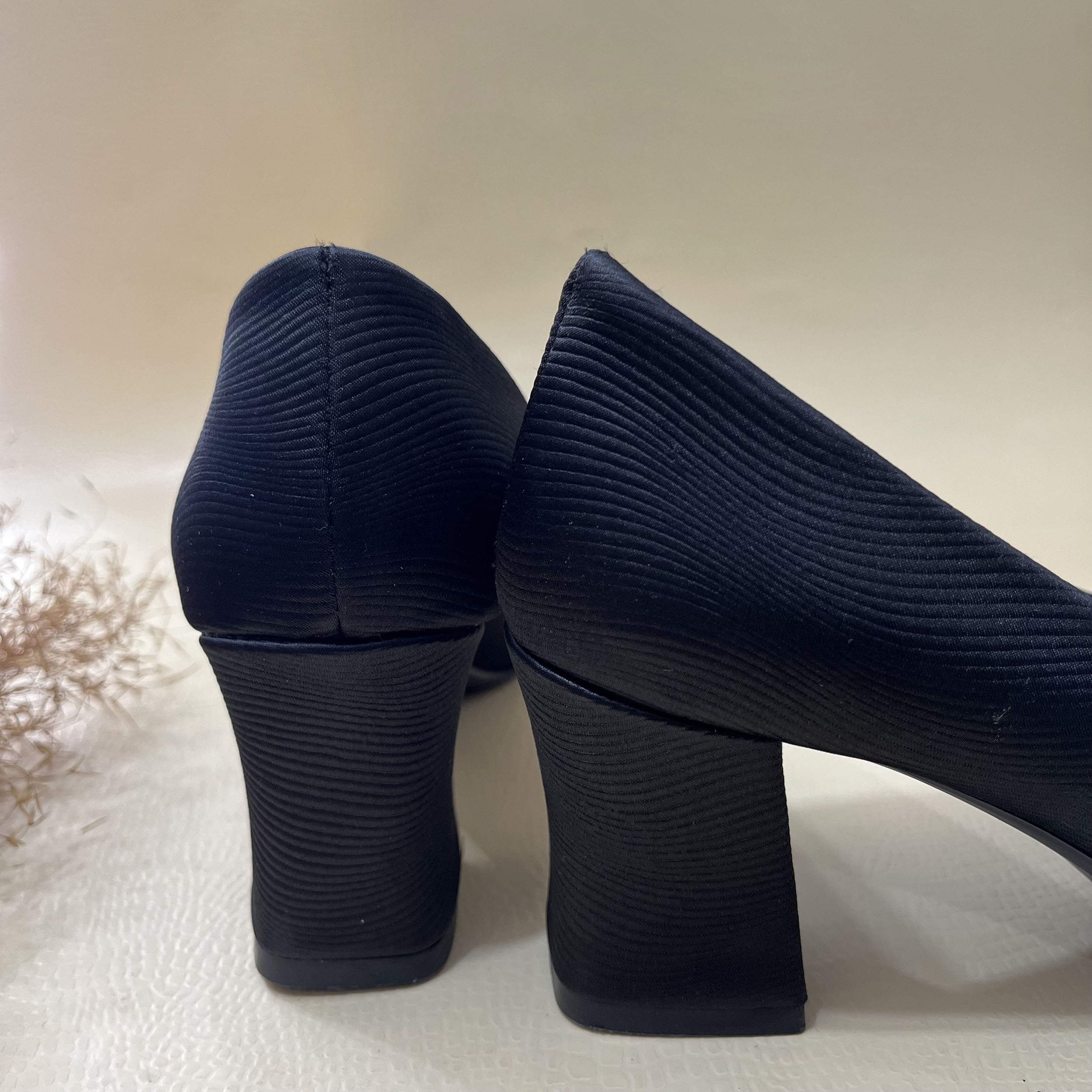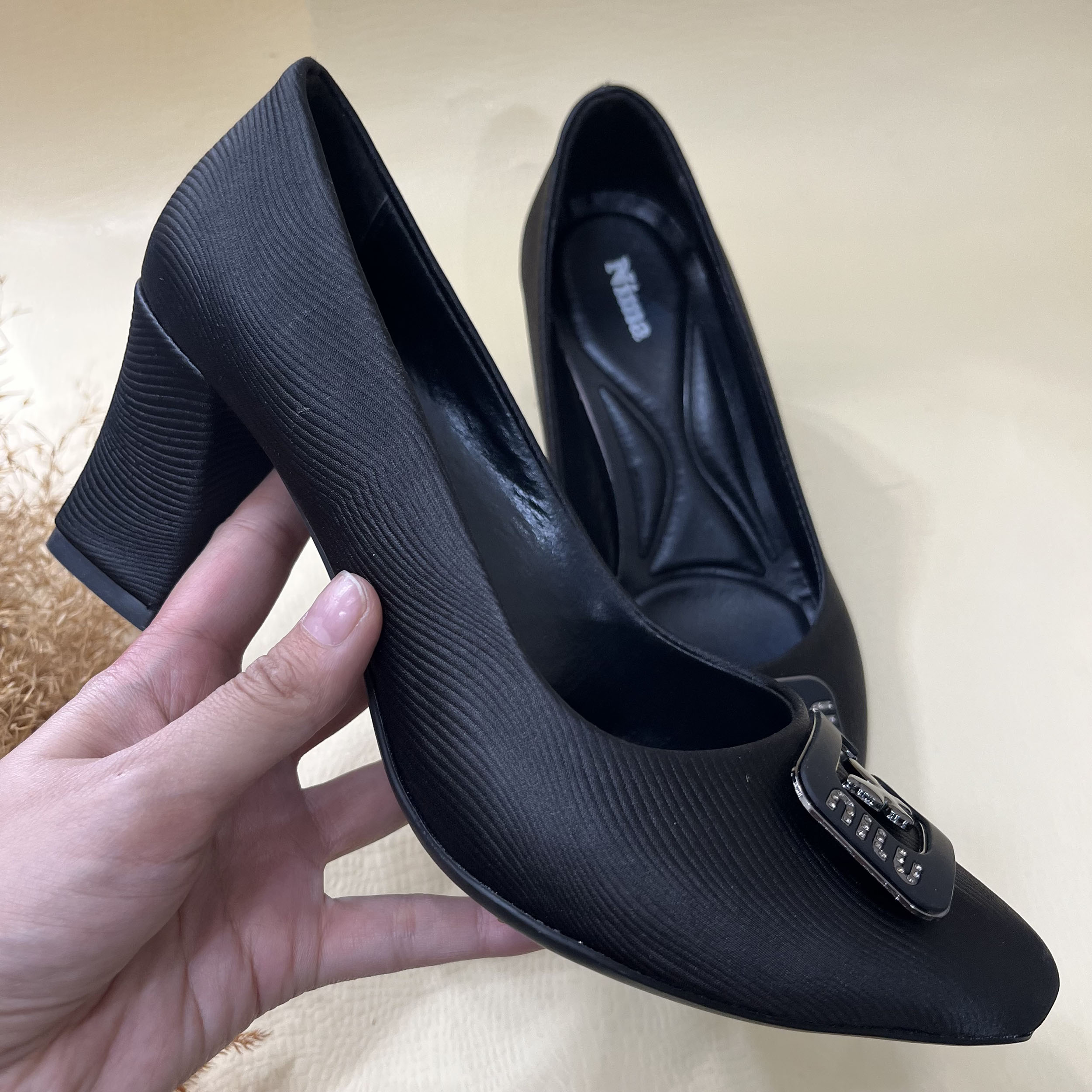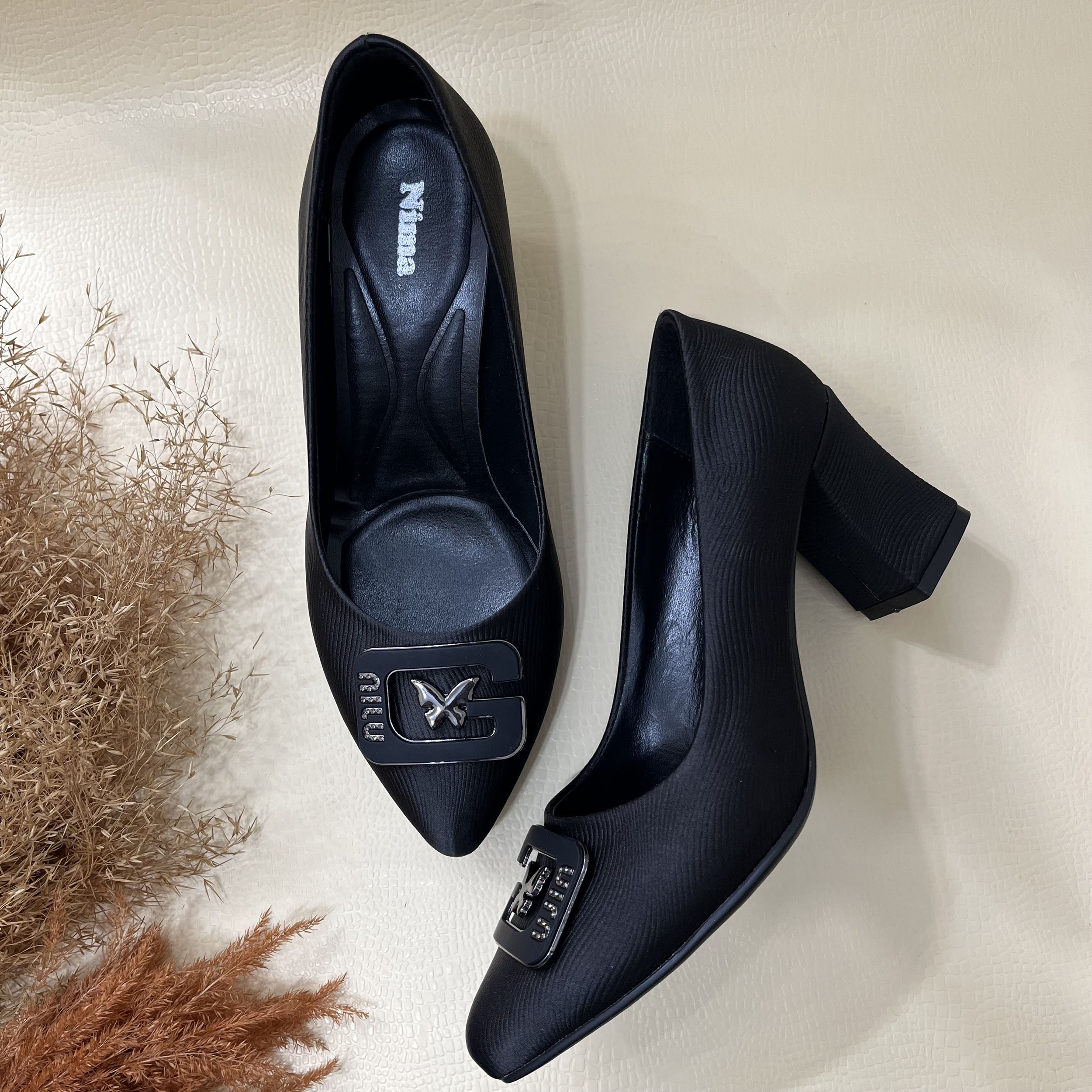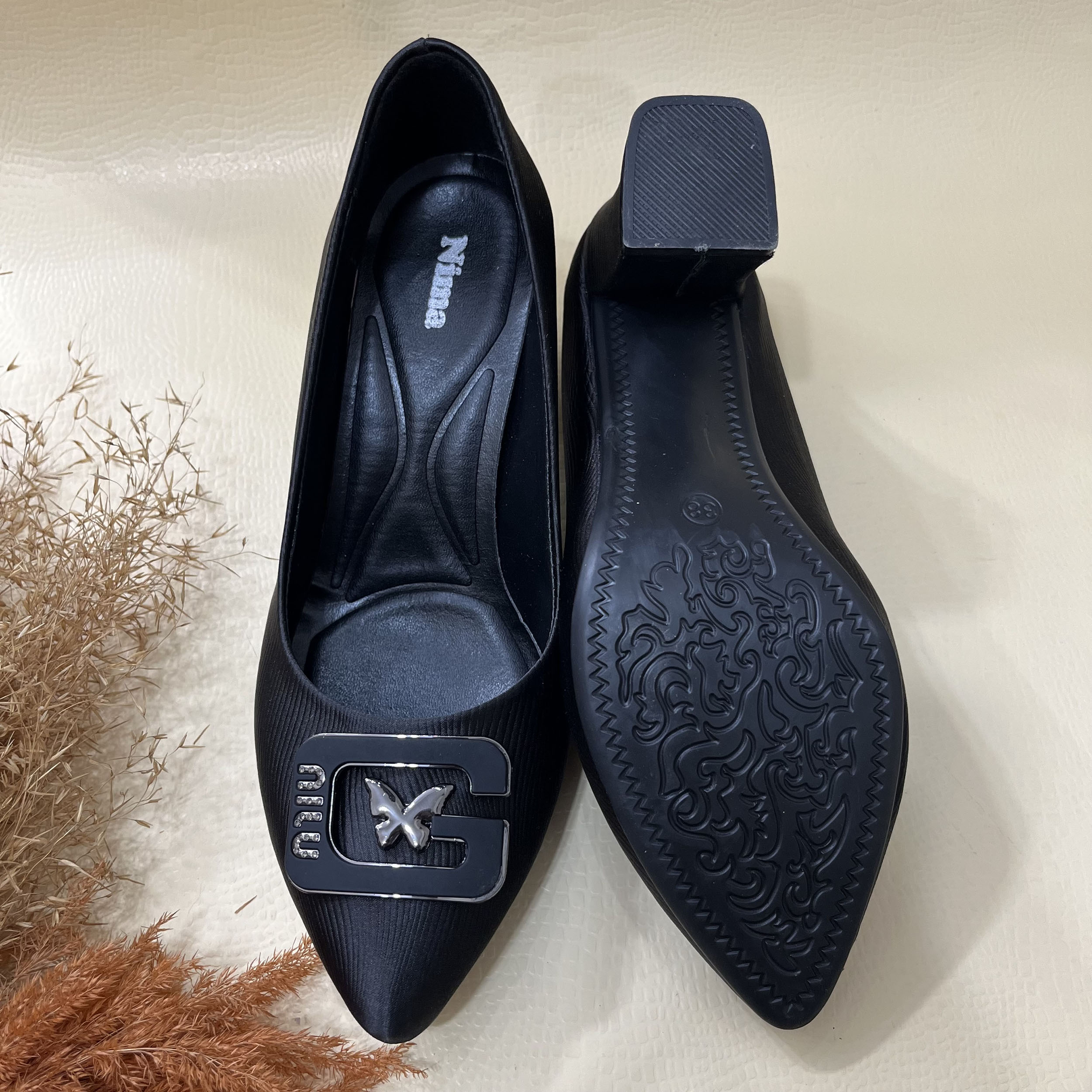 کفش پاشنه دار زنانه مدل نینو ، با رویه ساتن مشکی طرحدار درجه یک تهیه شده است.در کفی داخل کفش به جهت پر کردن قوس پا و راحتی بیشتر ، از پد های طبی استفاده شده است.ارتفاع پاشنه کفش 6 سانتی متر و سایزبندی ان استاندارد است