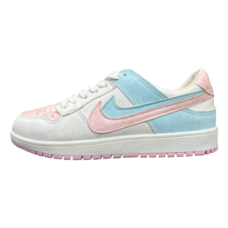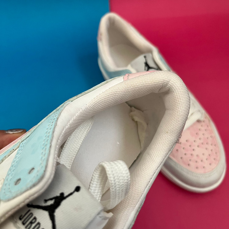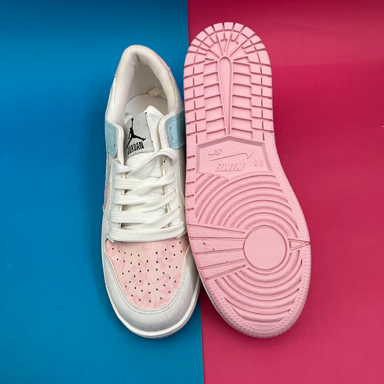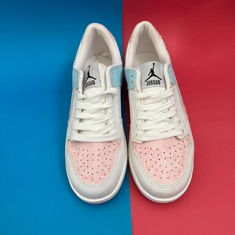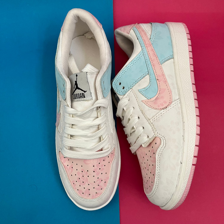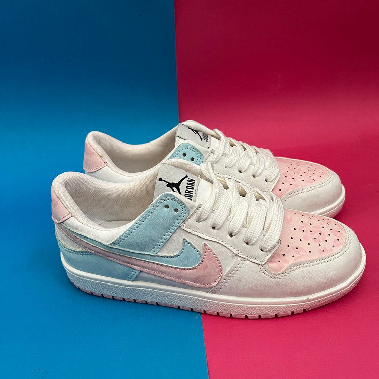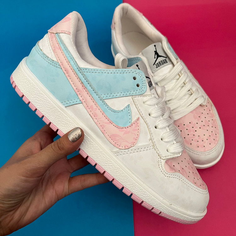 کفش ونس زنانه مدل ایر جردن صورتی ابی با رویه چرم صنعتی گل دار بسیار زیبا تهیه شده است . زیره این کار از جنس پی یو سبک و مقاوم دو رنگ سفید و صورتی در برابر شکستن تا سایش است .سایز بندی کفش استاندارد وتمام داخل کفش به جهت راحتی و تعریق مناسب با پارچه سوزنی آستر کشی شده است.
