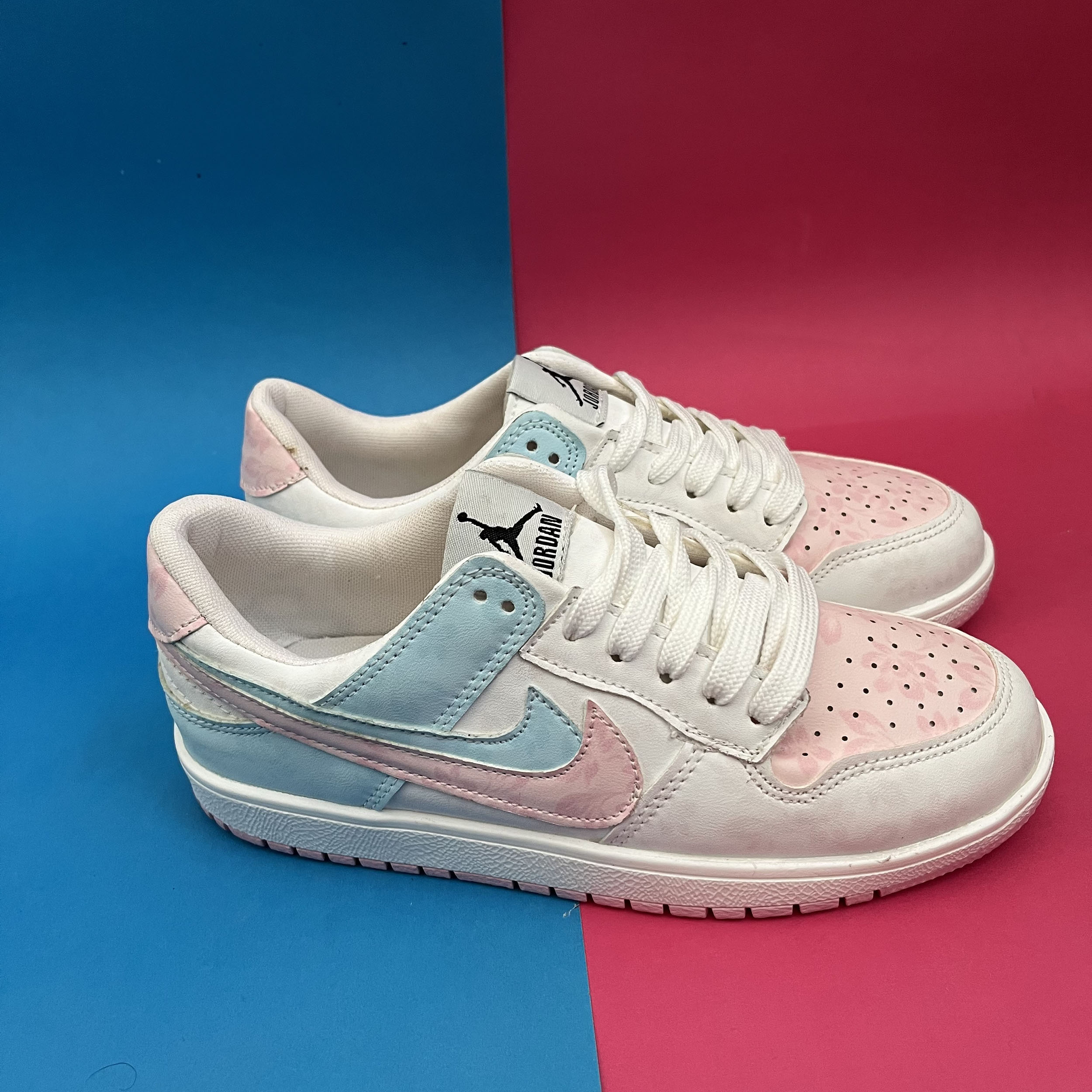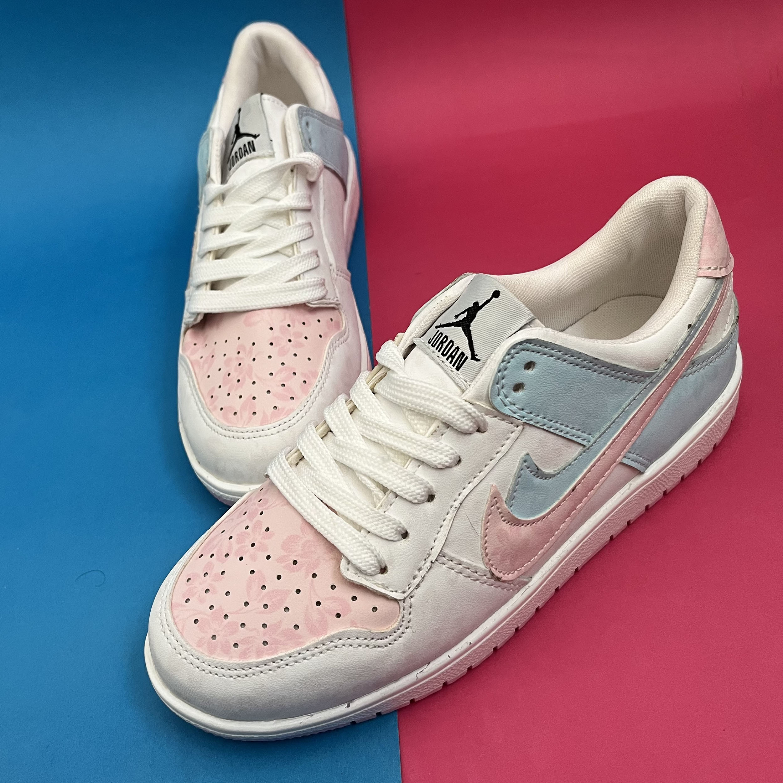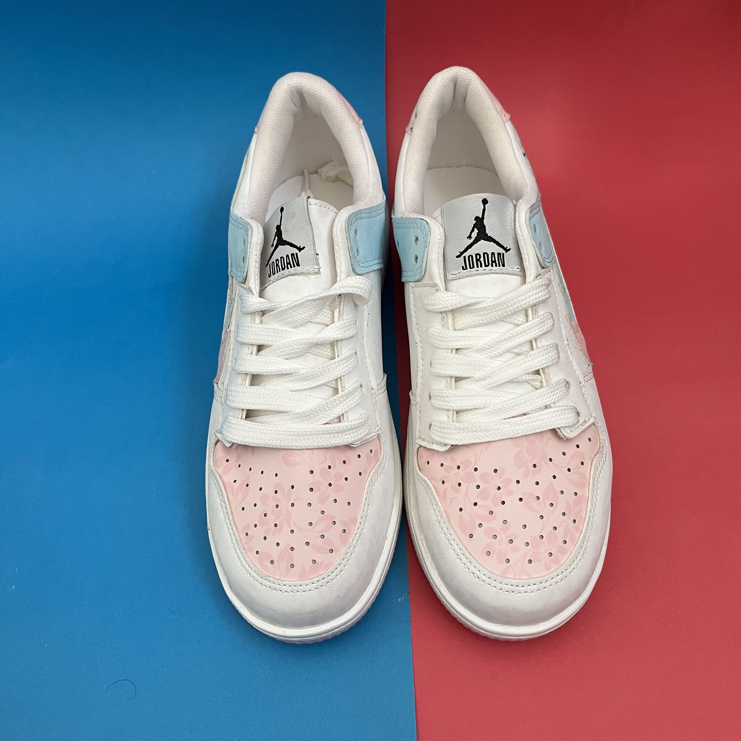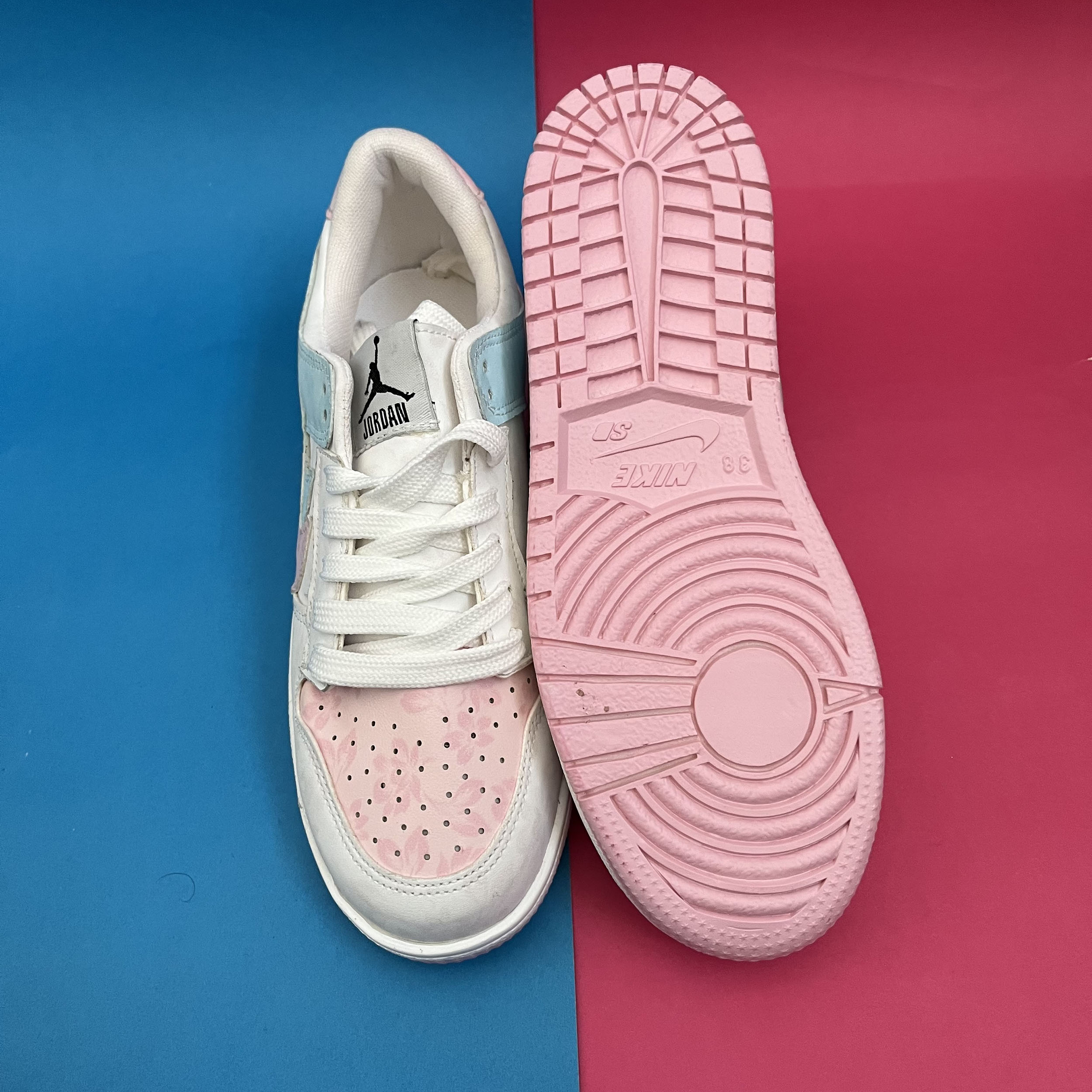کفش ونس زنانه مدل ایر جردن صورتی ابی با رویه چرم صنعتی گل دار بسیار زیبا تهیه شده است . زیره این کار از جنس پی یو سبک و مقاوم دو رنگ سفید و صورتی در برابر شکستن تا سایش است .سایز بندی کفش استاندارد وتمام داخل کفش به جهت راحتی و تعریق مناسب با پارچه سوزنی آستر کشی شده است.