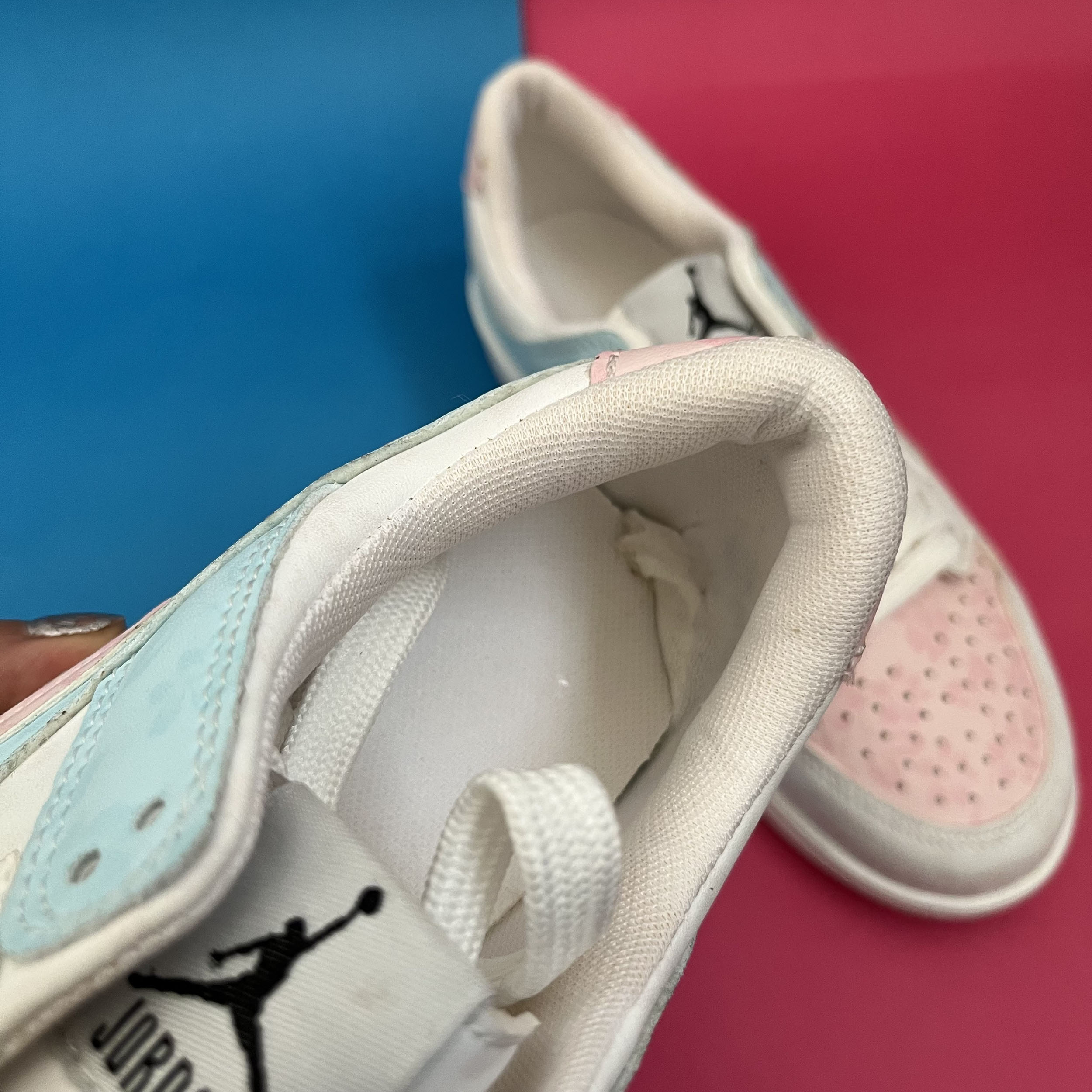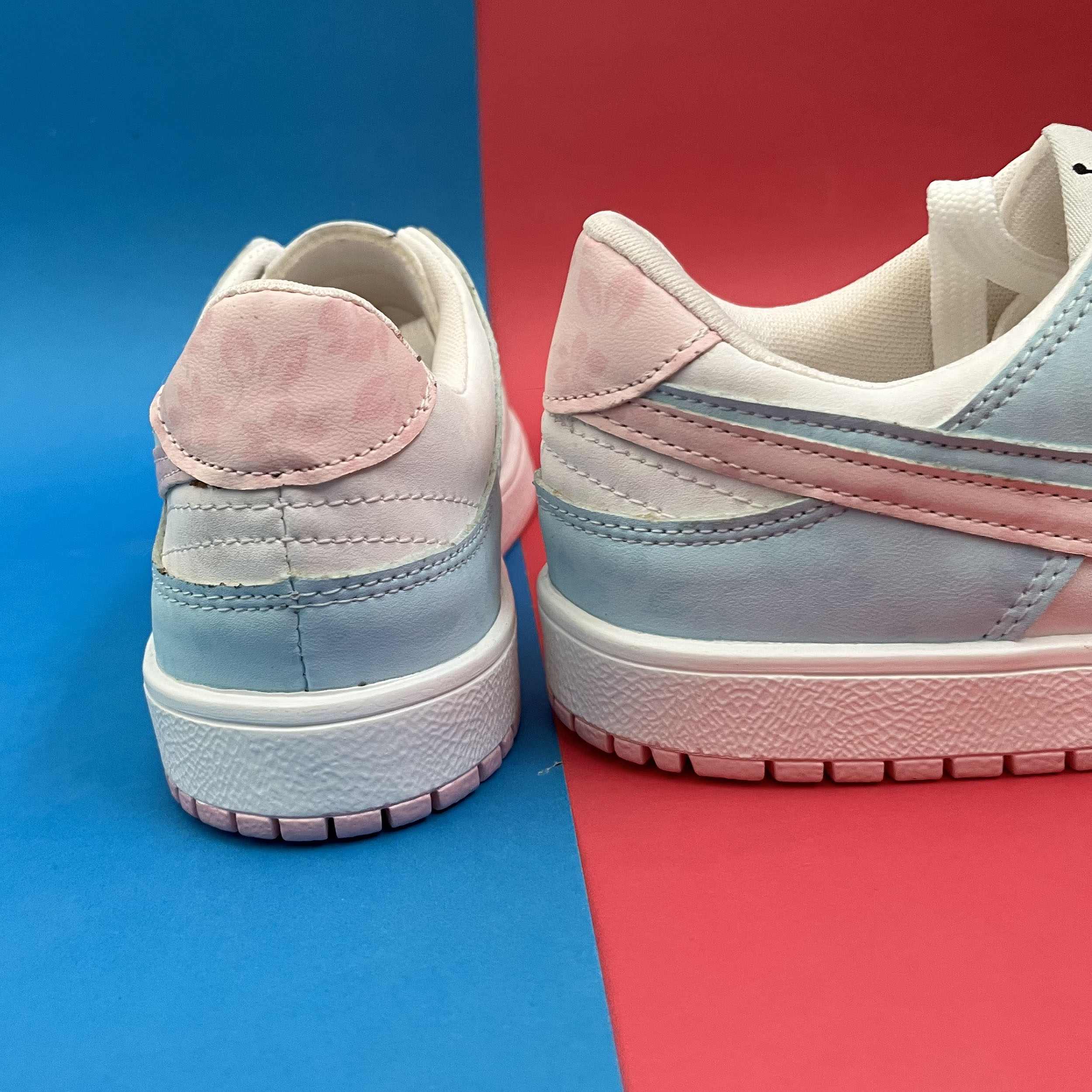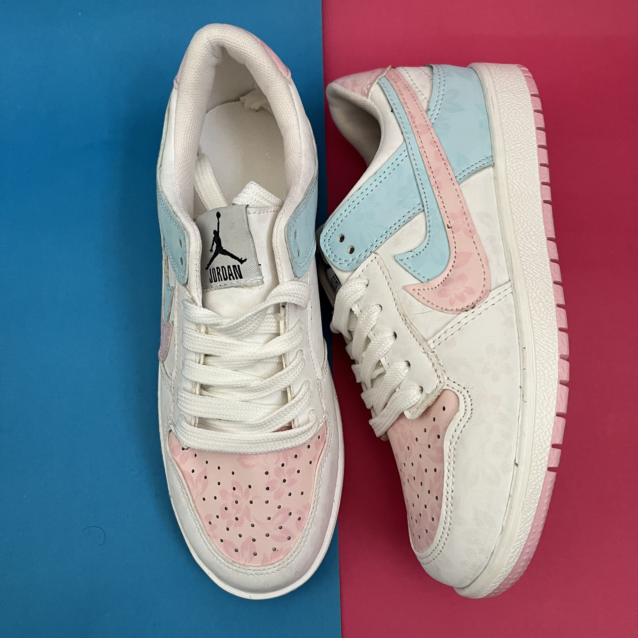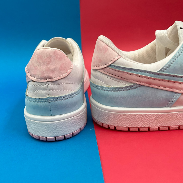 کفش ونس زنانه مدل ایر جردن صورتی ابی با رویه چرم صنعتی گل دار بسیار زیبا تهیه شده است . زیره این کار از جنس پی یو سبک و مقاوم دو رنگ سفید و صورتی در برابر شکستن تا سایش است .سایز بندی کفش استاندارد وتمام داخل کفش به جهت راحتی و تعریق مناسب با پارچه سوزنی آستر کشی شده است.